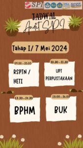 ENTRY MEETING SPI TAHAP I DIMULAI May 7, 2024 Category: Audit, Berita Comments Off on ENTRY MEETING SPI TAHAP I DIMULAI Satuan Pengendalian Internal (SPI) Unila melakukan entry meeting Tahap I dimulai pada hari Senin tanggal 7 Mei 2024. Adapun Unit yang akan diaudit tahap I ini adalah : RSPTN / HETI UPT Perpustakaan BPHM BUK