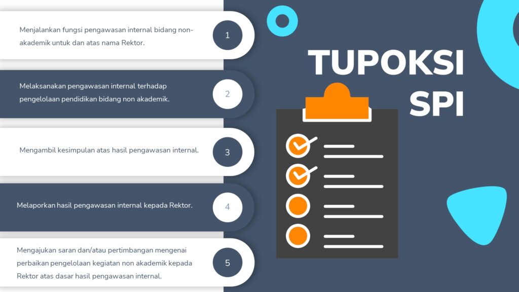 - Menjalankan fungsi pengawasan internal bidang non-akademik untuk dan atas nama Rektor.